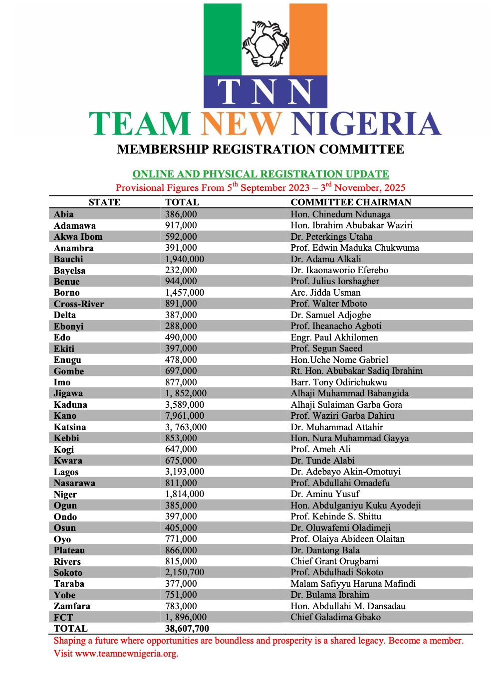 TNN is a national rejuvenation movement that was established to unite the Nigerian people and spearhead the struggle for fundamental political, social, and economic change under the name of Team New Nigeria. The founders of TNN believe in a Nigeria without poverty and injustice in which every person enjoys the right to a life with dignity in working together with other organisations to choose differently – individually and collectively a new path for Nigeria.